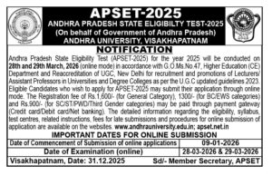 The Andhra Pradesh State Eligibility Test (APSET) 2025 notification has been officially announced by Andhra University in Visakhapatnam on 31.12. 2025.